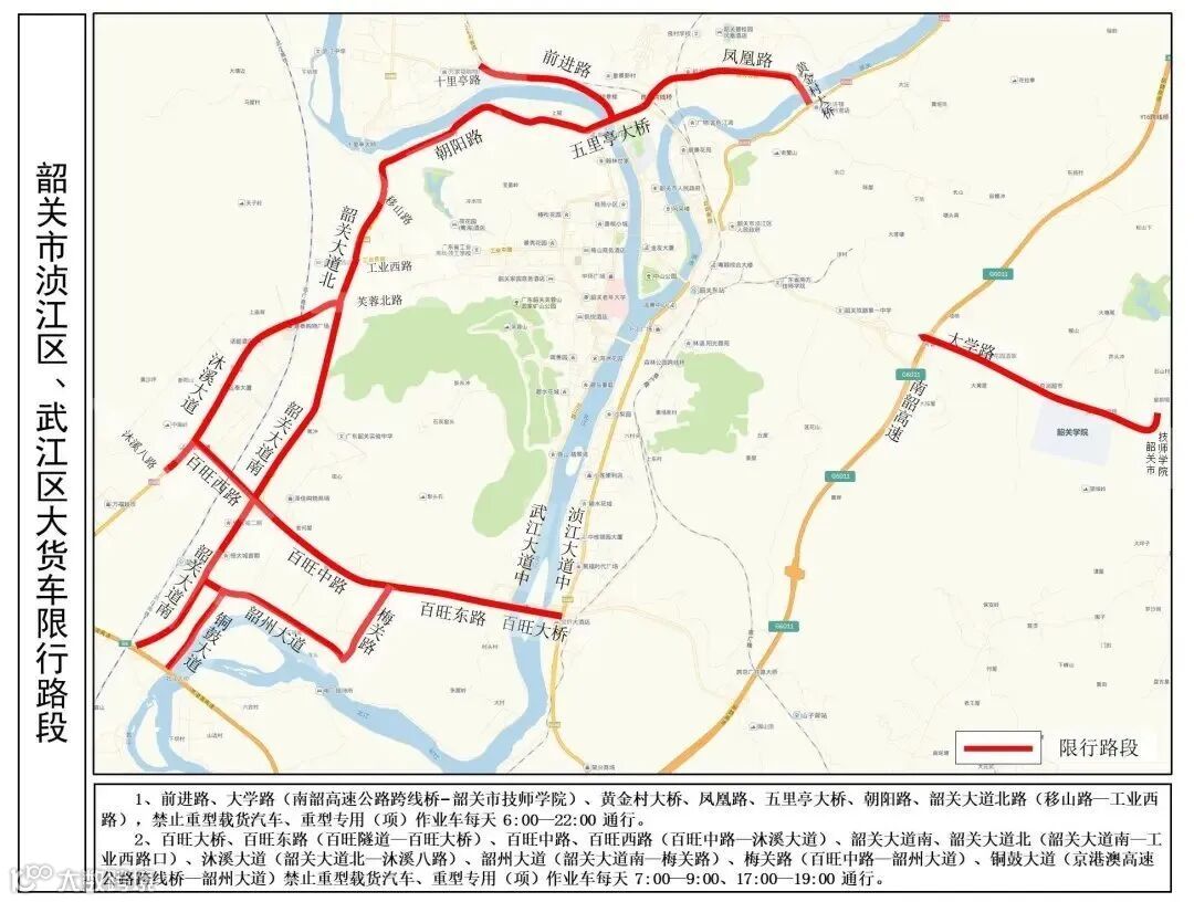 前进路、大学路(南韶高速公路跨线桥—韶关市技师学院)、黄金村大桥、凤凰路、五里亭大桥、朝阳路、韶关大道北(移山路—工业西路),禁止重型载货汽车、重型专用(项)作业车每天6:00—22:00通行。