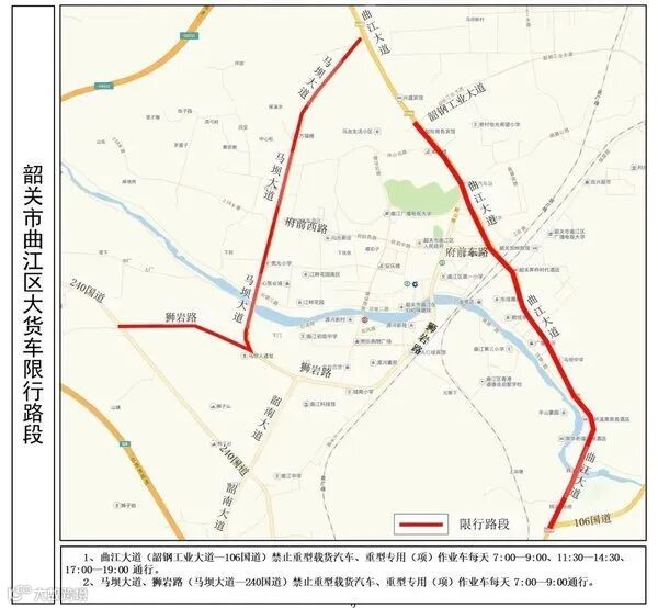 曲江大道(韶钢工业大道—106国道)禁止重型载货汽车、重型专用(项)作业车每天7:00—9:00、11:30—14:30、17:00—19:00通行。