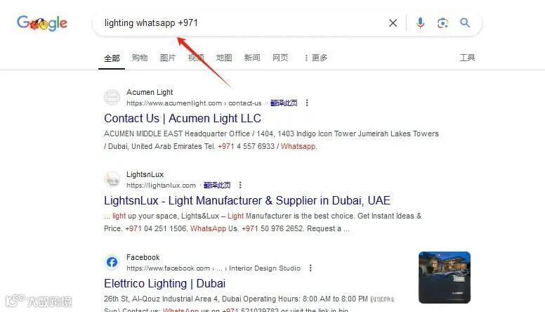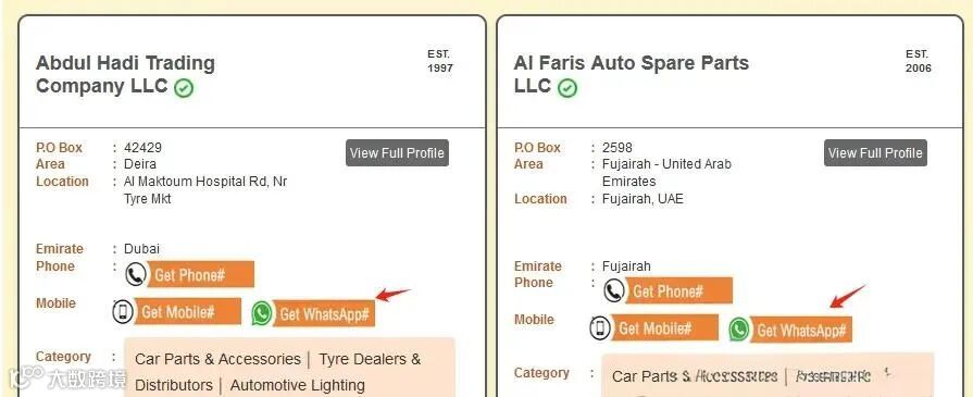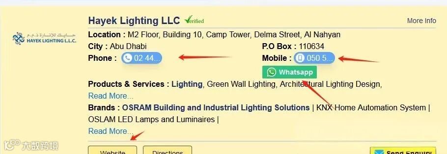 我顺手在网站上搜了搜 “灯具”,一下子就跳出好多阿联酋公司信息。这些公司的名称、地址、电话等信息都列得清清楚楚。其中,有一些客户还留下了 WhatsApp 联系方式。实际上,对于那些只留了电话号码的客户,大家也可以试着查一查他们有没有注册 WhatsApp。毕竟在阿联酋,当地客户特别爱用 WhatsApp 来沟通,通过这种方式,很可能挖掘出更多可联系的客户资源