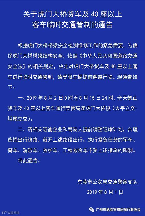 因虎门大桥桥梁安全检测维修工作的紧急需要,为确保大桥桥梁结构安全,依据《中华人民共和国道路交通安全法》的相关规定,交警部门决定在桥梁维修期间,对虎门大桥货车及40座以上客车进行临时交通管制,请受限车辆驾驶员知悉,并提前绕道行驶。