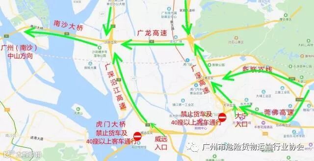 6、莞佛高速公路虎门大宁入口——绕行广深高速公路——广龙高速公路——南沙大桥——往广州(南沙)、中山方向