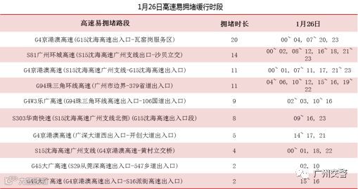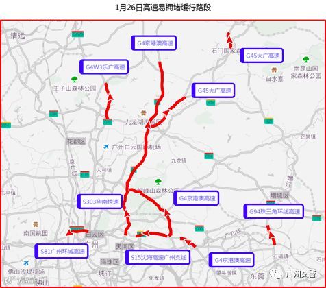 春运出程1月26日拥堵程度较高,易拥堵缓行的高速有:G4京港澳高速、S81广州环城高速、G94珠三角环线高速、G4W3乐广高速等;