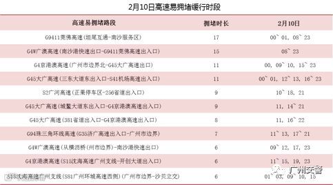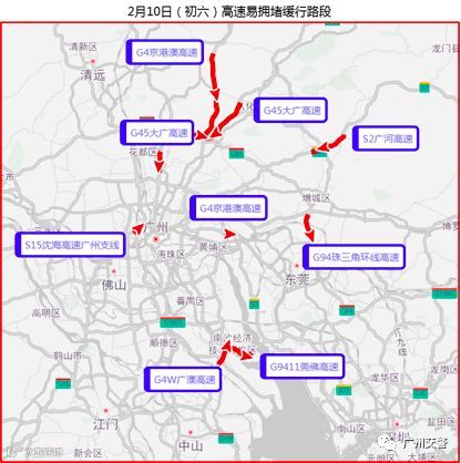 春运返程2月10日(正月初六)高速拥堵程度最高,易拥堵缓行的高速有G9411莞佛高速、G4W广澳高速、G4京港澳高速、G45大广高速等。