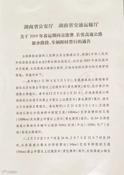 湖南省春运期间京港澳、 长张高速公路部分路段、车辆限时禁行