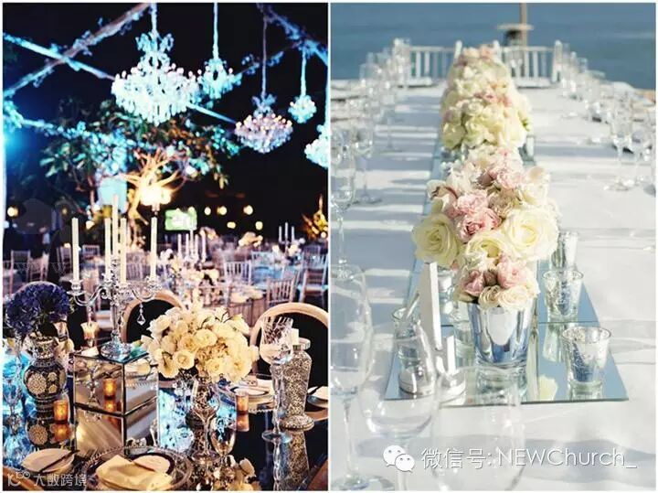 在婚礼场地布置一些独特的镜面装饰,倒影反射效果会让你的宴会场地显得更加空旷梦幻。镜面里映射出摇曳的美丽烛光,让整个空间散发出无可挑剔的优雅魅力!