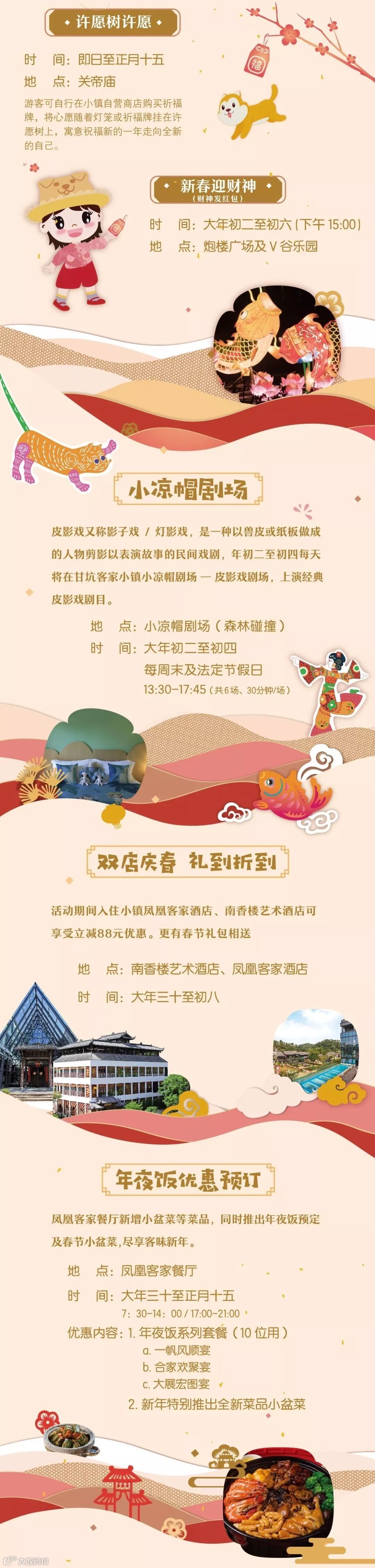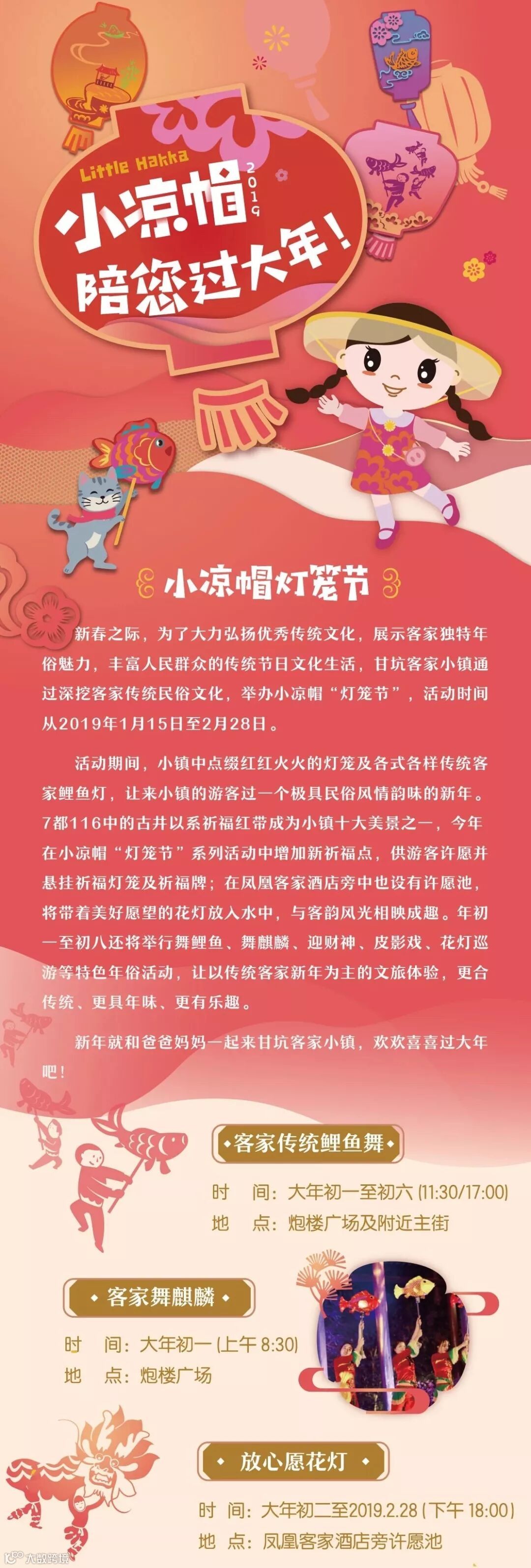 “灯笼节”不但有红红火火的灯笼及各式各样传统客家鲤鱼灯,还有多样年俗活动。7都116村中的古井因系祈福红带成为小镇十大美景之一,今年在小凉帽“灯笼节”系列活动中增加新祈福点,供游客许愿并悬挂祈福灯笼及祈福牌;在小凉帽农场中也设有许愿池,将带着美好愿望的花灯放入水中,与自然田园风光相映成趣。活动期间还将举行舞鲤鱼、舞麒麟、写春联等特色年俗活动,年初一至初六,还将增加迎财神、皮影戏、花灯巡游等年俗活动,让以传统客家新年为主的文旅体验,更合传统、更具年味、更有乐趣。以下是灯笼节的详细时间点,请仔细观看哦。