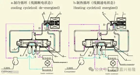当电磁阀线圈处于通电状态,先导滑阀在电磁线圈产生的磁力作用下克服压缩弹簧的张力而右移,高压气体进入毛细管后进入左端活塞腔,另一方面,右端活塞腔的气体排出,由于活塞两端存在压差,活塞及主滑阀右移,使排气管与室内机接管相通,另两根接管相通,形成制热循环。