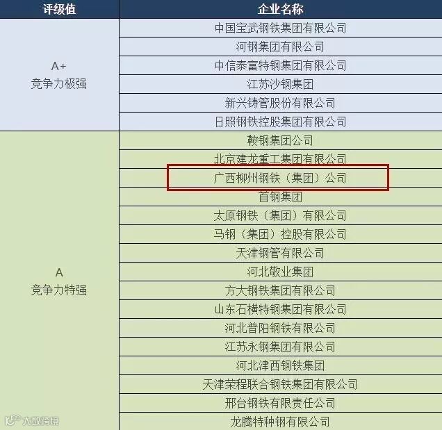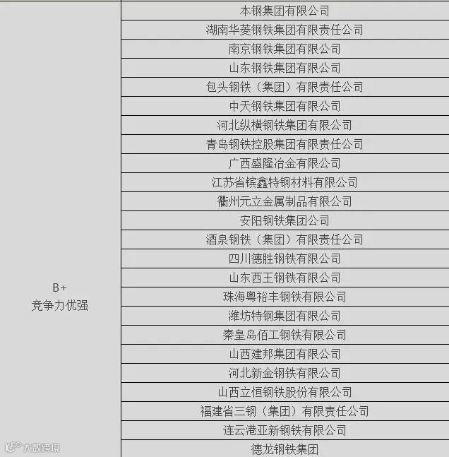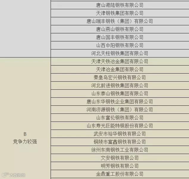 2016年12月12日,冶金工业规划研究院发布了2016年中国钢铁企业综合竞争力评级报告。本次参与竞争力评级的对象,包括大多数的重点统计钢铁企业,吸纳了部分其他钢铁企业,排除信息缺失严重的钢铁企业后,共有111家钢铁企业进入本次竞争力评级范围,合计粗钢产量占全国总产量的85%。