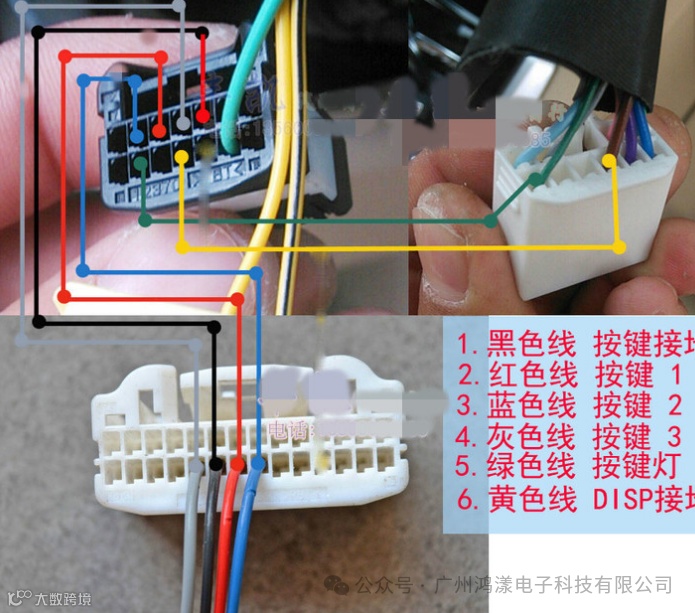 下面这个图是多功能按键安装从游丝下面飞线到主机后面的接线说明(很简单,对应接好就可以):