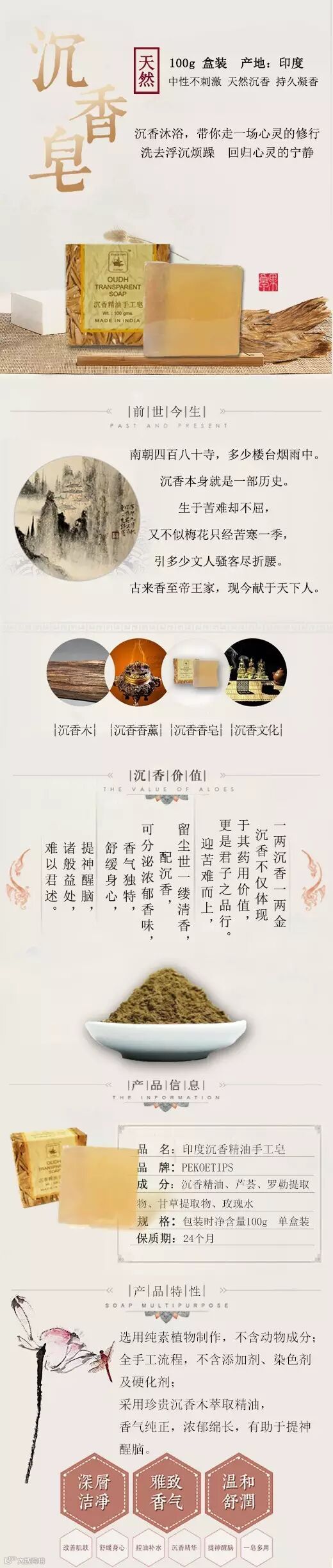印度沉香精油手工皂,印度原产。 采用珍贵沉香木萃取精油,香气纯正,浓郁绵长,有助于提神醒脑。