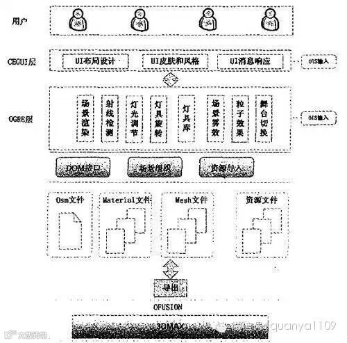 资源层:由3DMAX + Ofusion插件导出,生成场景组织,材质,实体,贴图等系统所需的资源文件。