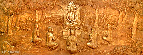 佛陀于菩提伽耶悟道之后,应大梵天神的三次祈请决定开始弘法。他观察因缘,发现过去跟随自己苦行,现在在波罗奈斯国鹿野苑的憍陈如等五人可堪教化,于是前往鹿野苑。这五人因为佛陀放弃苦行而离开了他,当佛陀到达鹿野苑时,五位行者远远望见他,他们商定,对于这样的懈怠者,不要去欢迎承侍他。然而随着佛陀越走越近,他们不由自主的起身迎接。他们一开始并不了解佛陀已经证悟,因为在他们的观念里,苦行才是唯一的途径,经过佛陀耐心的申明始才信服,成为最早的比丘。佛陀对他们宣讲了《转法*轮经》,开示了四圣谛“苦、集、灭、道”的真理。这是佛陀第一次正式的说法,所以鹿野苑也成为佛陀初转法*轮地。