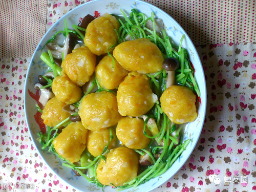 4.将炸好的葛粉丸放入摆好青菜的碟上,装盘即可
