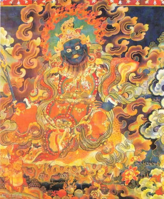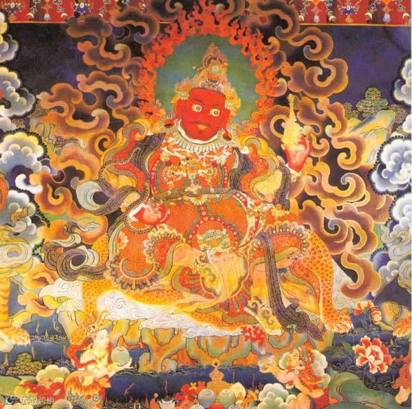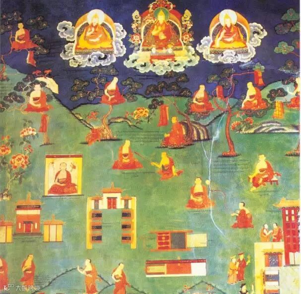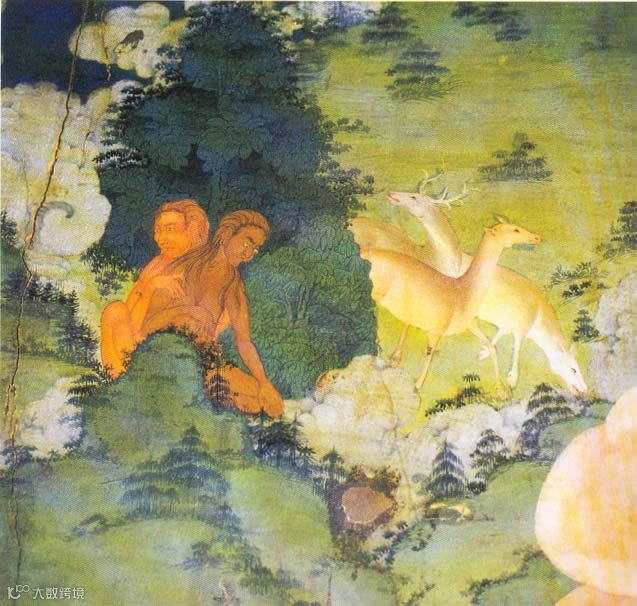 藏族的先祖神猴(观音菩萨的化身)与岩石罗刹女成婚,生下六个食肉的红脸小孩的情景。所以藏族人认为自己是观世音菩萨的后代。