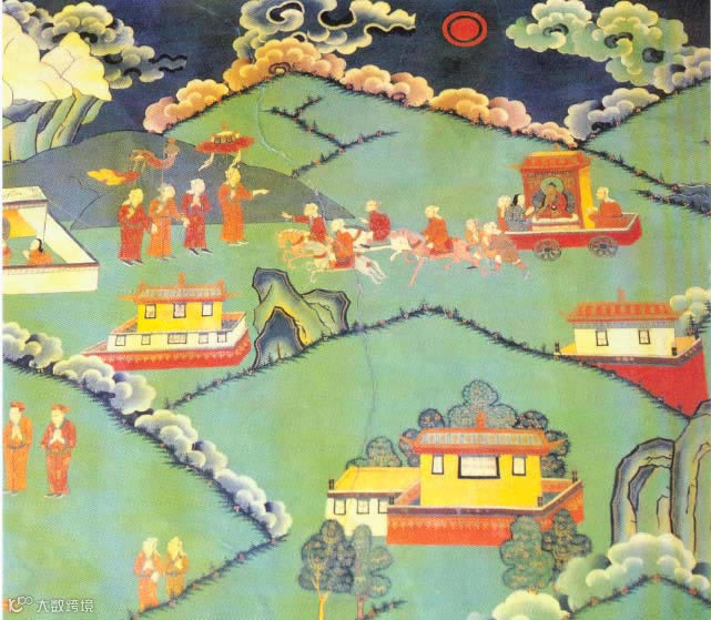 唐朝时,松赞干布与吐蕃君臣迎接文成公主进藏,于中国所携带释迦牟尼12岁等身像—觉沃佛的情景。