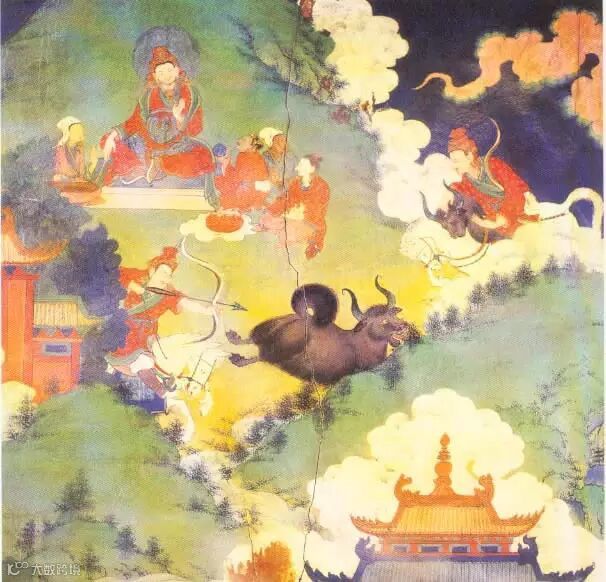 北方取盐图。讲述了吐蕃赞普囊日松赞在北方猎杀野疯牛,返回途中,捎于马鞍上的肉掉落盐地,始知盐味的故事。
