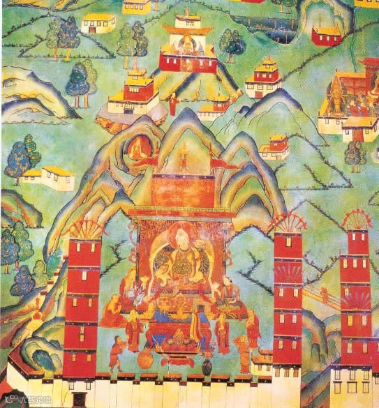 吐蕃赞普松赞干布时期布达拉宫的形状,宫殿顶部均饰有旗帜和长矛。该壁画是五世达DL喇嘛重建布达拉宫时,以大昭寺一幅可信壁画为范本而作。