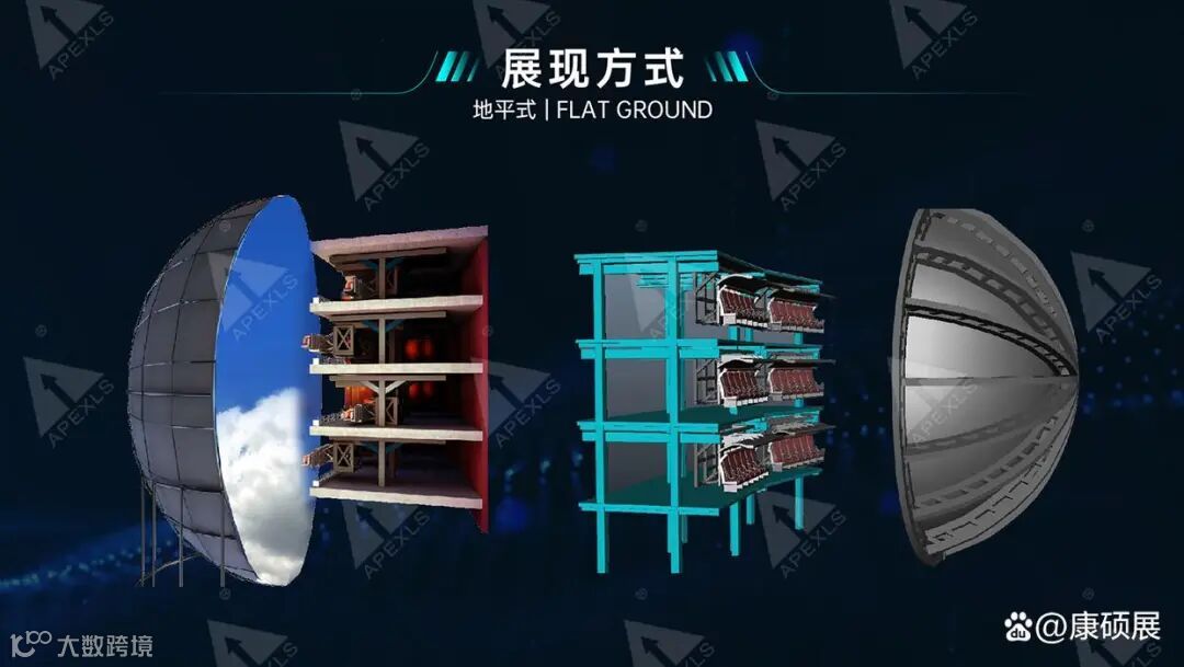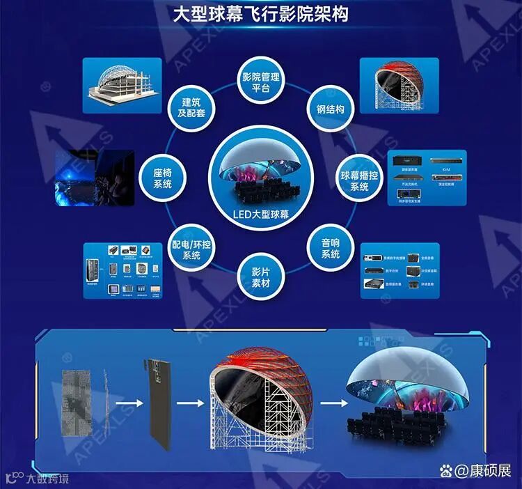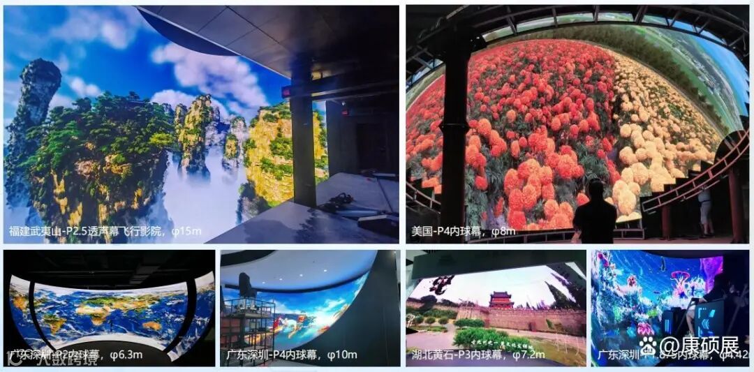 康硕展2015年研发出世界第一片7.2米LED内球幕,拥有行业领先的专利技术及设计方案。康硕展沉浸式LED球幕解决方案:包括项目创意设计、结构设计与施工、LED模块定制、控制系统和软件、创意主题内容、功能定制等。已成功落地福建武夷山、深圳后浪新天地、美国剧院等项目。
