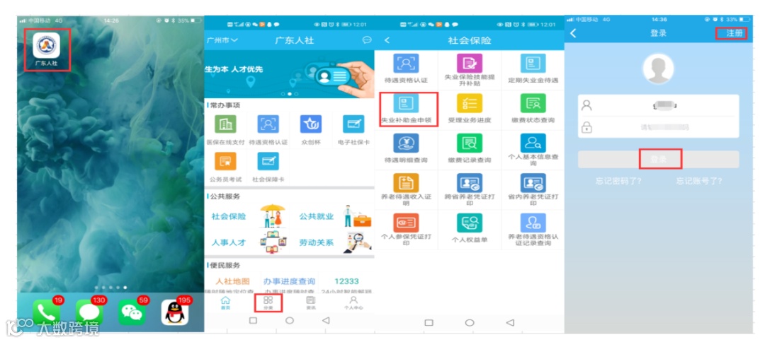 (1)手机下载广东人社APP:点击广东人社 >分类>失业补助金申领>注册获取账号、密码进行登陆>失业补助金申领,如下图: