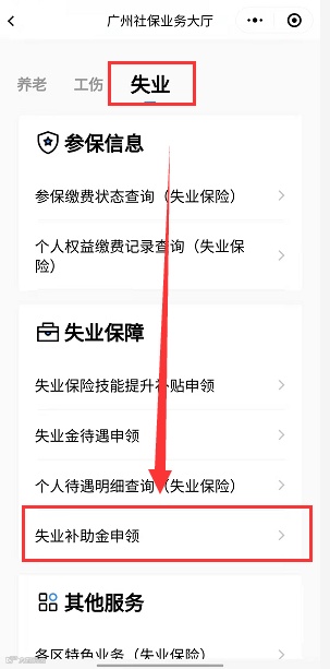 进入“粤省事”微信小程序→点击“办事”页面→选择“社保”常用服务→点击“失业”分类→选择“失业补助金申领”