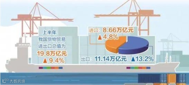 据海关统计,2022年上半年中国货物贸易进出口总值19.8万亿元,同比增长9.4%。其中,出口11.14万亿元,增长13.2%;进口8.66万亿元,增长4.8%。