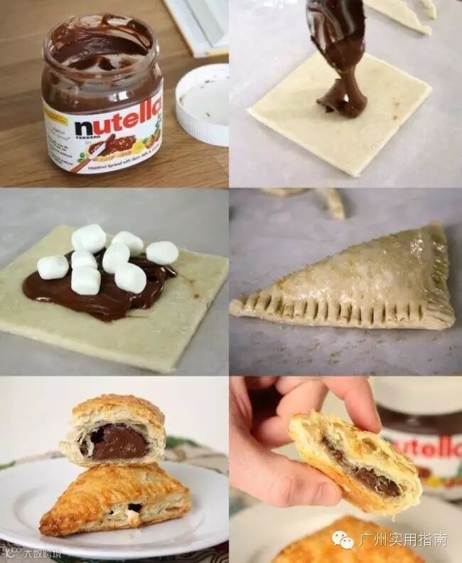 用巧克力酱涂在起酥片上,放上棉花糖,在外表涂上一层蛋黄~超好吃