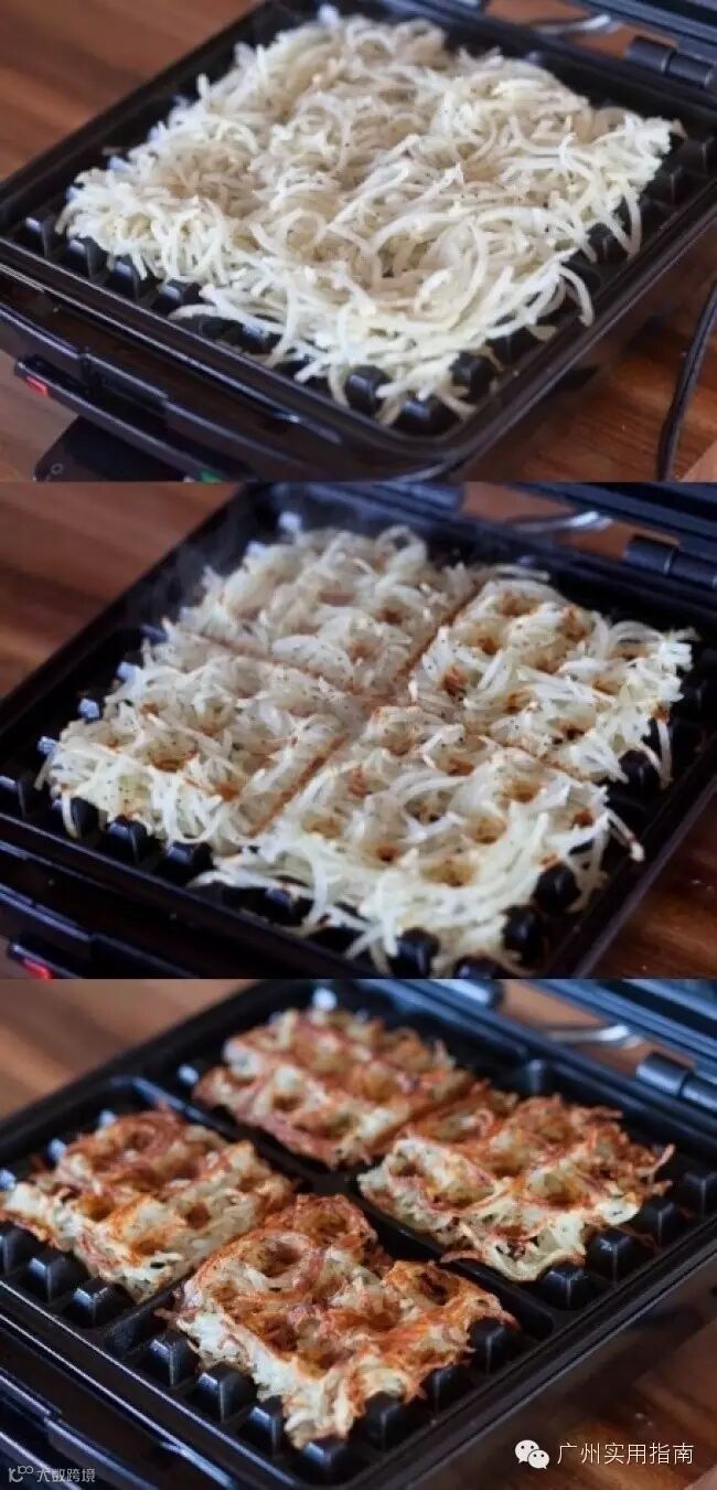 使用切丝的马铃薯直接铺在松饼机上,加上调味料及起司,几分钟后你就可以吃到超好吃的马铃薯松饼(小编当初以为是吻仔鱼…)