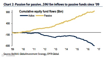 近年来,被动投资正在稳步蚕食主动投资的市场份额。《华尔街日报》援引晨星公司数据,在截至8月31日的3年中,投资者向被动型共同基金及被动型交易所交易基金(ETF)投入了近1.3万亿美元资金,与此同时,从主动型基金中撤出了超过2500亿美元资金。