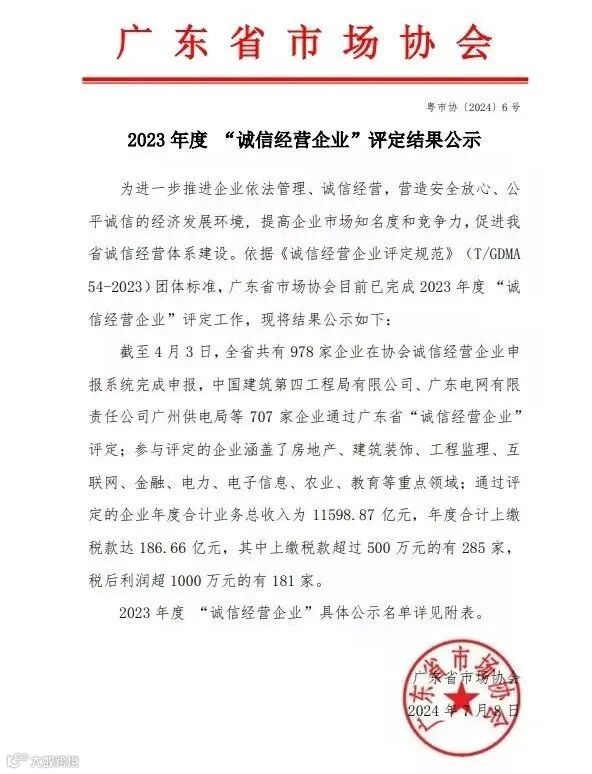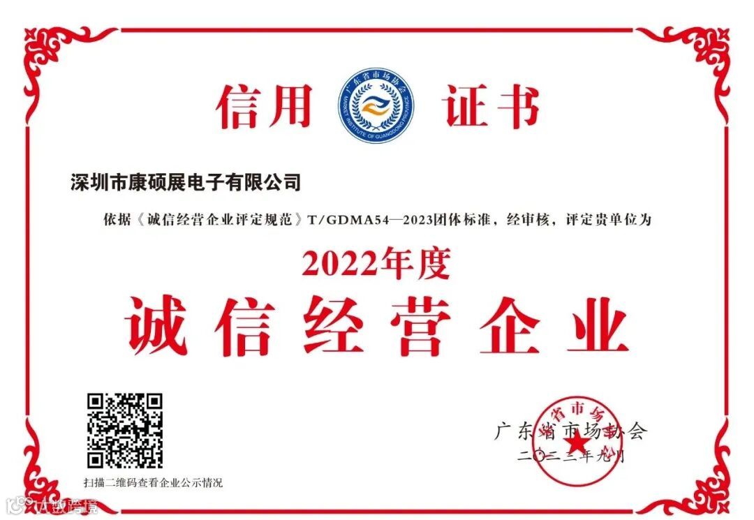近日,广东省市场协会授予康硕展2023年度“诚信经营企业”荣誉称号,以表彰我司在守信经营方面的突出表现。这是康硕展坚持深入推动诚信经营所取得的重要成果。