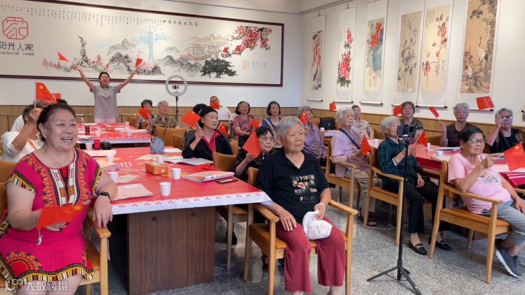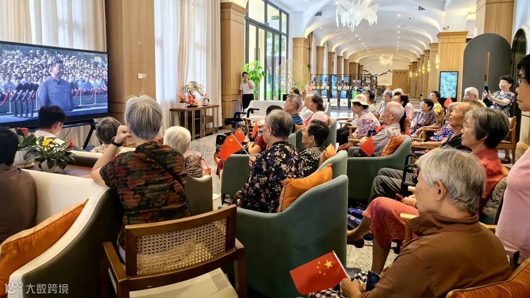 社区组织长者们齐聚大厅观看阅兵仪式现场,长辈们手持小红旗,目光专注追随着屏幕中的受阅方阵,共同见证国之威仪,度过了一段难忘时光。