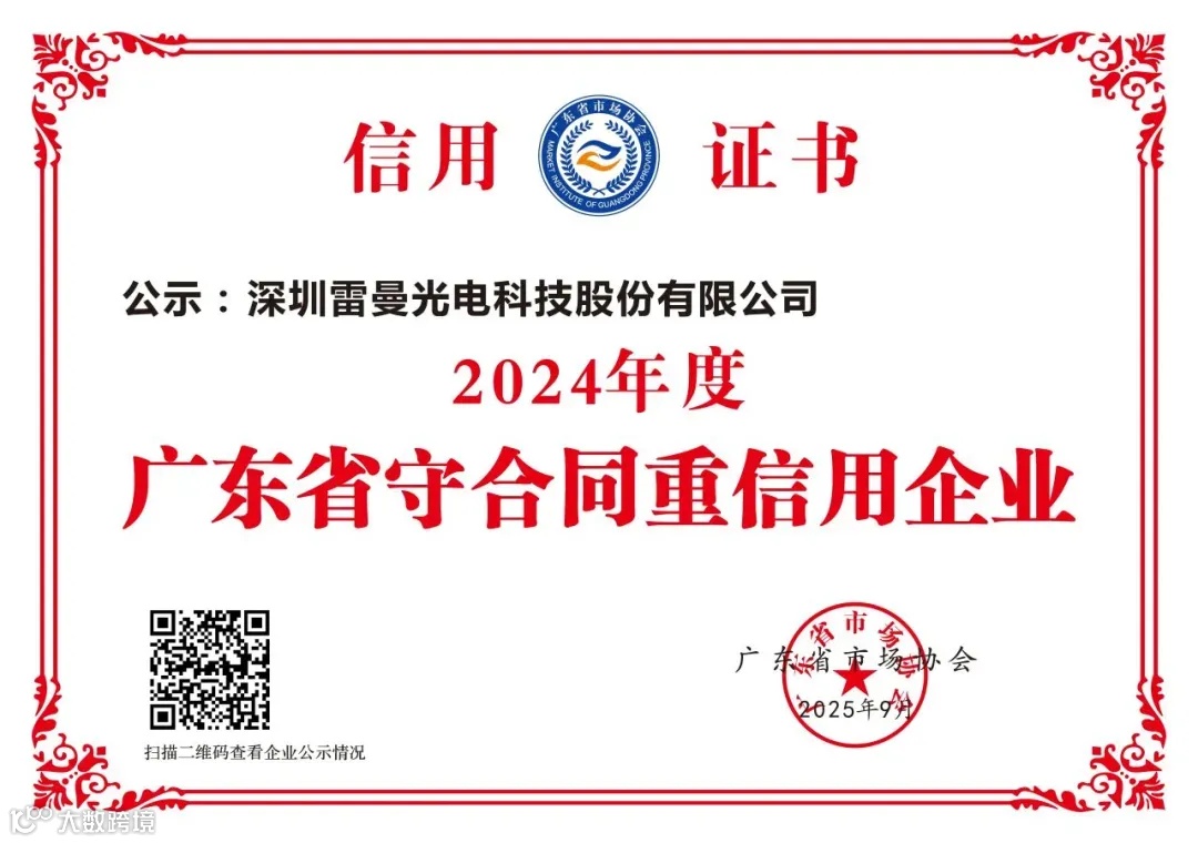 近日,广东省市场协会正式公布2024年度“广东省守合同重信用企业”名单。康硕展及其母公司雷曼光电(股票代码:300162)凭借健全的信用管理体系、卓越的合同履约能力以及良好的社会声誉再度入选。至此,两家企业已连续六年荣获该荣誉称号。这一荣誉是对二者长期践行社会责任、坚守诚信经营理念的高度认可。