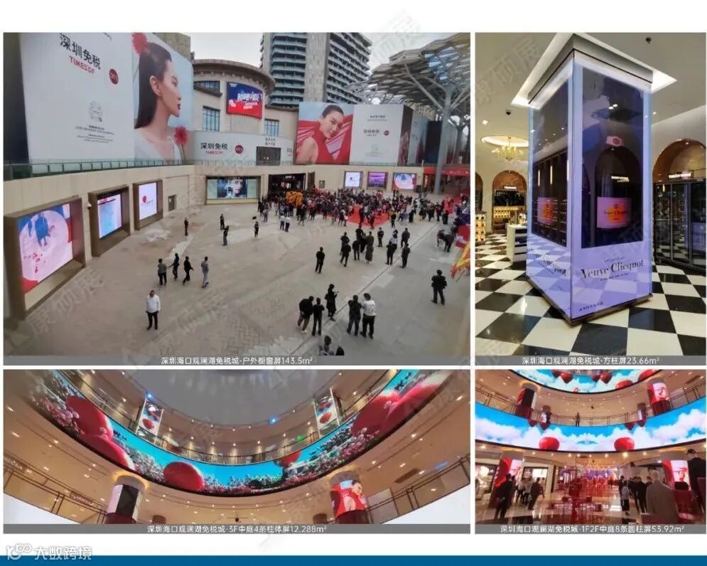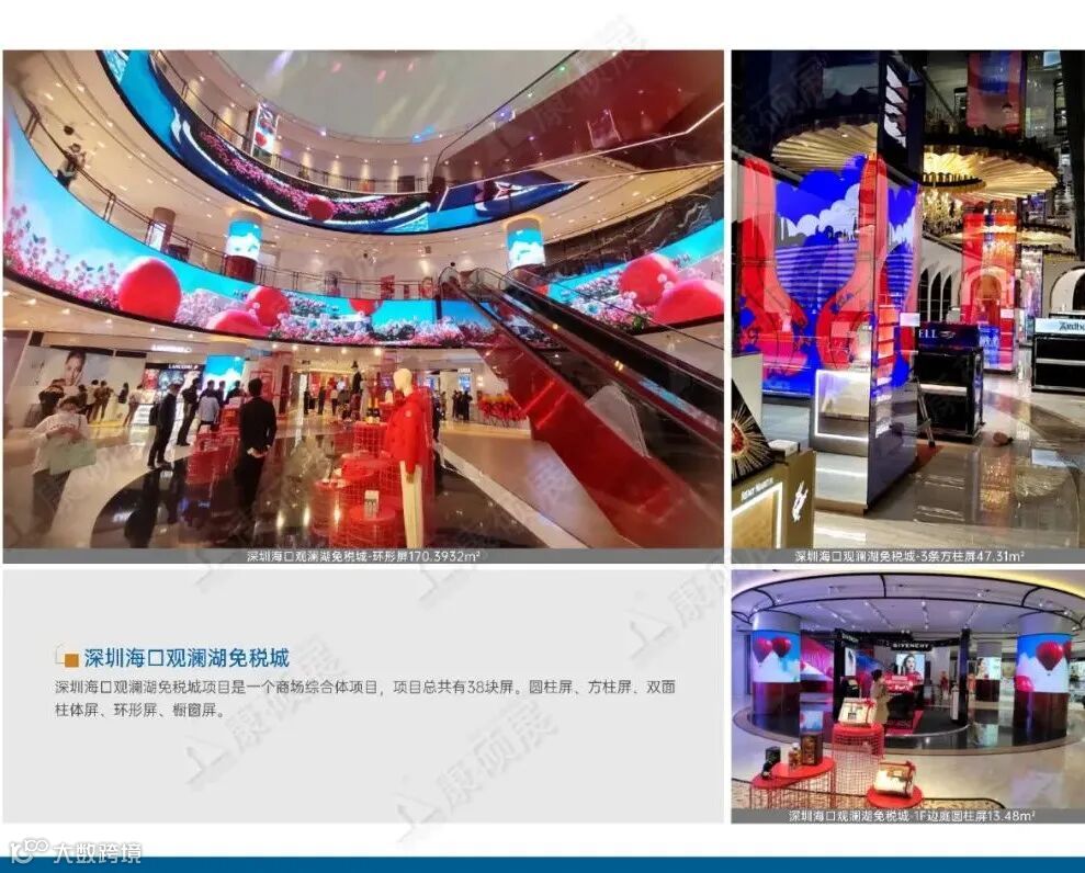 雷曼康硕展共计为深圳免税海口观澜湖免税城打造了38块LED显示屏,包含圆柱屏、方柱屏、双面柱体屏、环形屏、橱窗屏等异形屏,将免税城打造成为拥有400+奢华品牌、20000+平方米的生活交际、旅游休闲“品质示范”中心,为消费者带来舒适的购物体验,引导国人崇尚品质生活的消费理念,引领充满时代精神的生活方式。