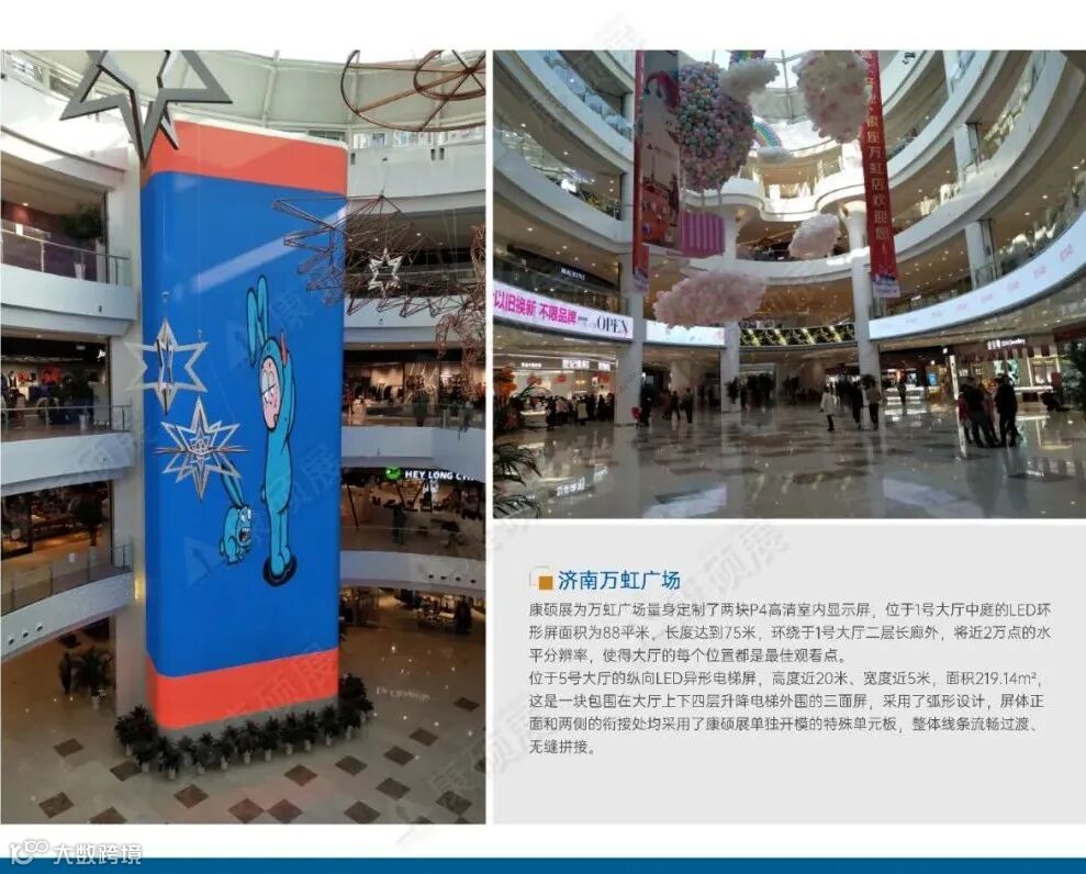 雷曼康硕展为济南万虹广场量身定制了两块P4高清室内显示屏,1号大厅中庭的LED环形屏面积为88平米,长度达75米,水平分辨率将近2万点,环绕于1号大厅二层长廊外,使得大厅的每个位置都是最佳观看点。5号大厅的纵向LED异形电梯屏采用了弧形设计,屏体正面和两侧的衔接处均采用了康硕展异形设计,高度近20米、宽度近5米,面积达219.14m²,三面屏将大厅上下四层升降电梯包围。康硕展定制的LED显示屏整体线条流畅过渡、无缝拼接,外观创意十足,为万虹广场增添了独特的魅力,让购物充满多重乐趣,成为万虹广场一道亮丽的风景线。
