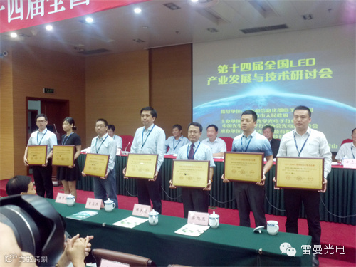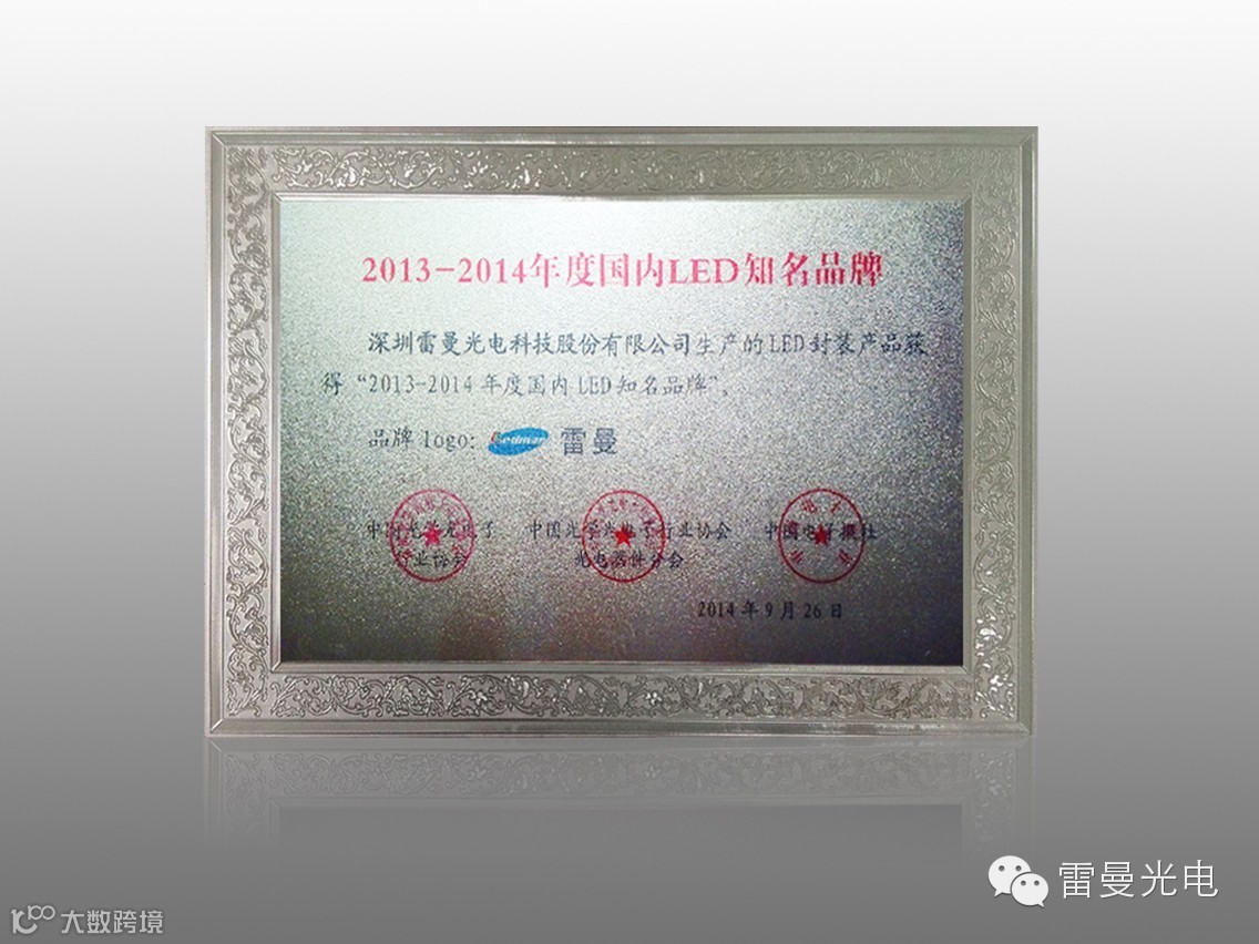会议同期,举行了“2013-2014年度国内LED知名品牌(芯片及封装)”的颁奖仪式。该奖项由中国光学光电子行业协会、中国光学光电子行业协会光电器件分会和中国电子报社共同发起并组织,经过企业单位申报、理事单位投票、网络投票、专家评议和名单公示环节,历时3个多月最终确认获奖名单。凭借自主创新成果、核心技术、知识产权;产品和服务质量在同行业中处于领先地位;拥有良好的社会信用;注重安全生产和环境保护,坚持低碳和循环经济等各方面综合因素,雷曼光电荣获“2013-2014年度国内LED知名品牌(芯片及封装)”。