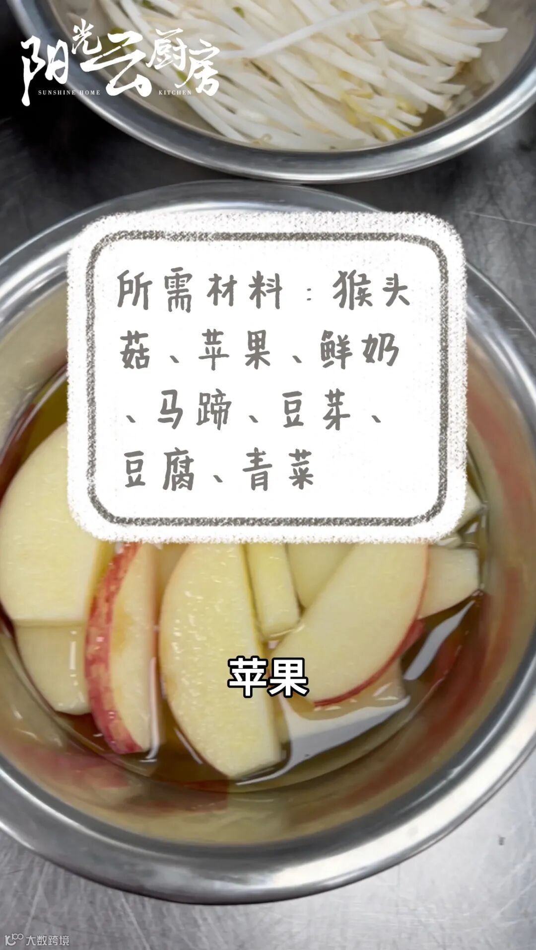 制作奶汤:苹果洗净切片,与豆芽、油菜一起冷水下锅,煮出味道后加入牛奶,加入少许盐调味