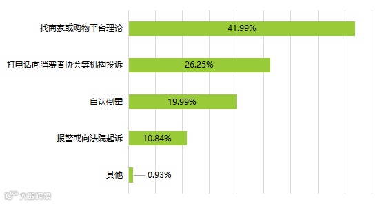 当遇到消费纠纷时,41.99%的老人找商家或购物平台理论,26.25%的老人打电话向消费者协会等机构投诉,19.99%的老人自认倒霉,表明老年人在消费维权方面仍缺乏必要的引导与帮助。