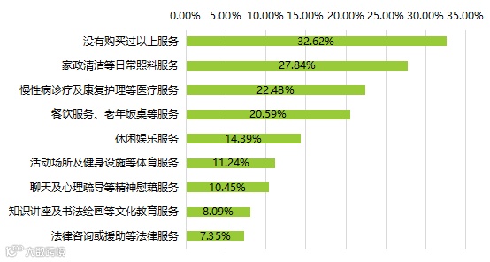 但老人需求转化为实际消费行为的比例较低,购买过家政清洁等日常照料服务的受访者占比27.84%,慢性病诊疗及康复护理等医疗服务的购买者占比22.48%,购买过餐饮服务、老年饭桌等服务的占比20.59%。