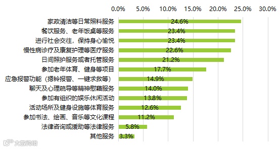 家政、清洁(24.6%),餐饮、老年饭桌(23.4%),社会交往(23.4%)是居家养老更需要的服务内容,其中80岁及以上的老年人还更需要康复护理和日间照料服务。