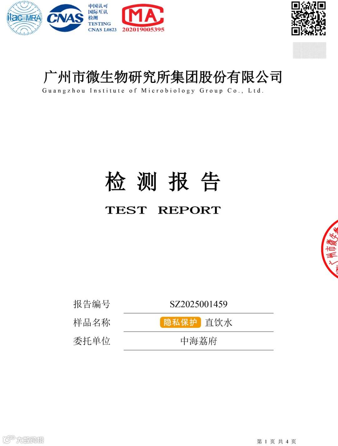 为保障每个用户的饮水安全和品质,高得管道直饮水每季度定期从中海荔府采取水样送至第三方机构检测水质,并公示水质检测报告。