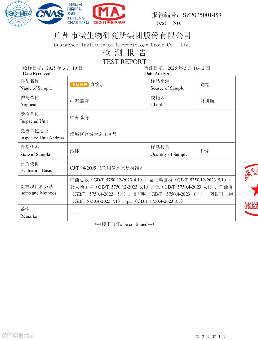 水质检测标准为CJ94-2005《饮用净水水质标准》,检测项目包含细菌总数,总大肠菌群,粪大肠菌群,色度,浑浊度,臭和味,肉眼可见物,pH值,本季度采取终端出水口水样全部检测合格,业主可以安心使用。