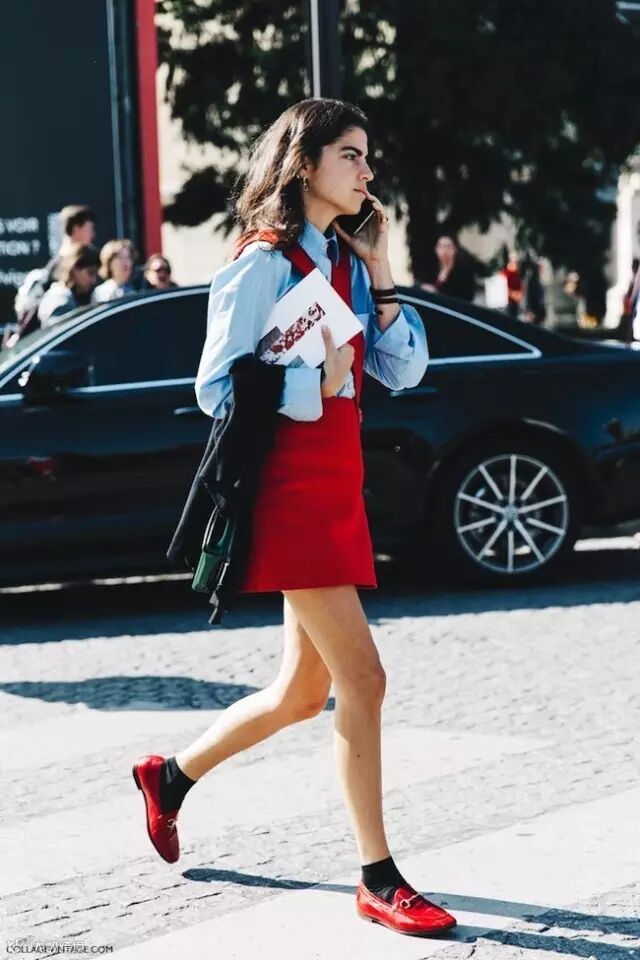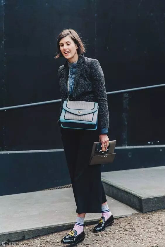 牛津鞋或者乐福鞋本身有一种“不那么女孩”的中性美丽,因此非常适合叠加短袜。乐福鞋搭配短裙或者阔腿裤,帅气又文艺。▼