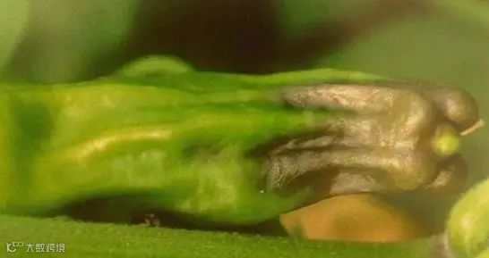 8 描述:辣椒果一直不长,有的畸形没有籽,有的形成大头果,最后形成僵果。是怎么回事?