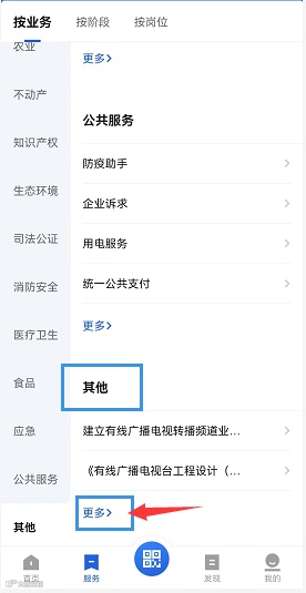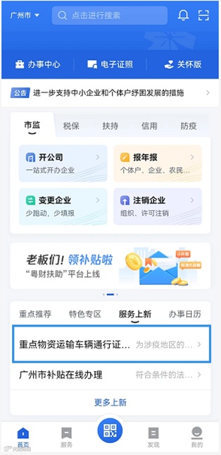 2.在粤商通APP主界面中查看服务上新,查找到重点物资运输车辆通行证申请(见下图),或选择“服务——按业务分类——选择其他——选择更多”。
