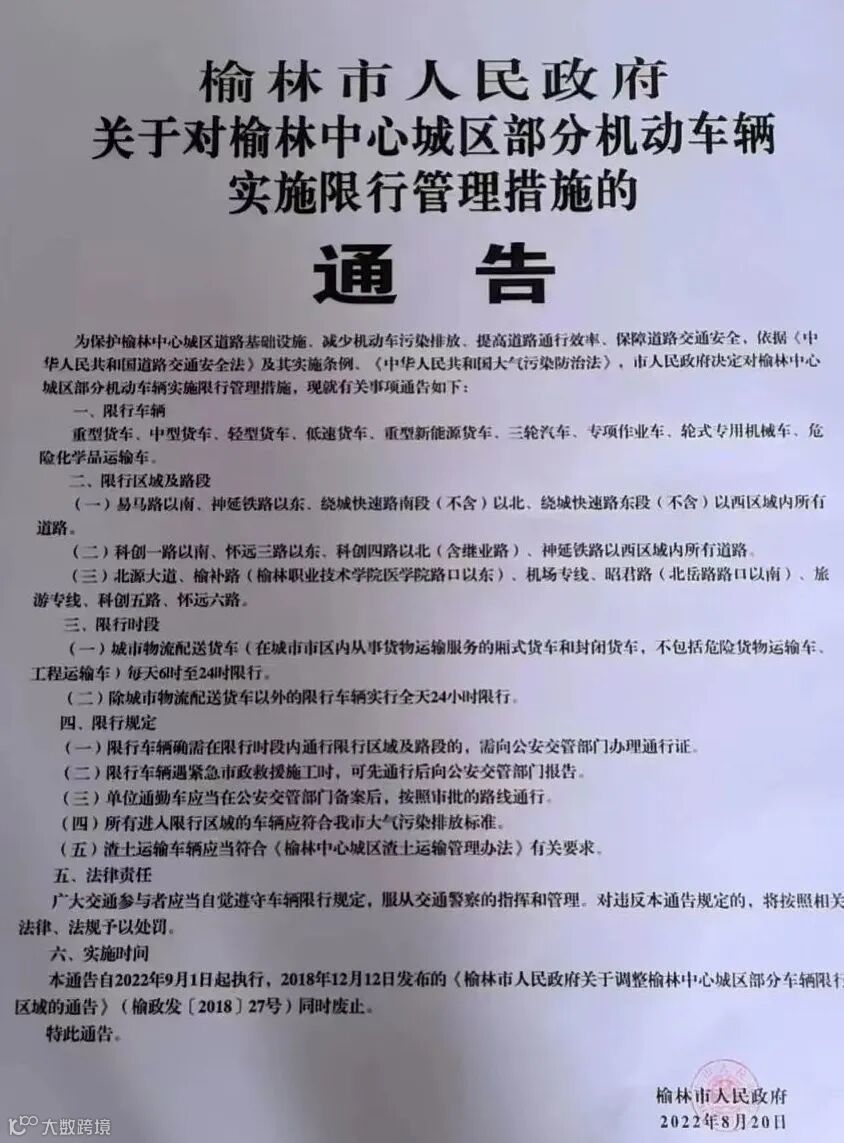 本通告自2022年9月1日起执行,2018年12月12日发布的《榆林市人民政府关于调整榆林中心城区部分车辆限行区域的通告》(榆政发{2018}27号)同时废止。