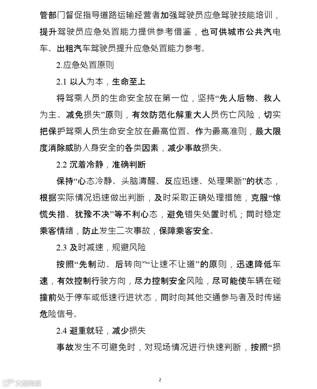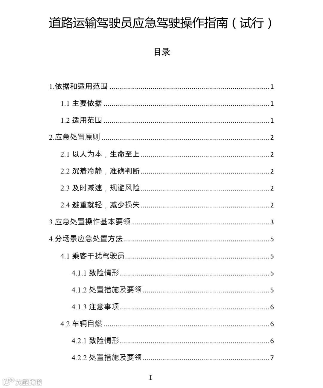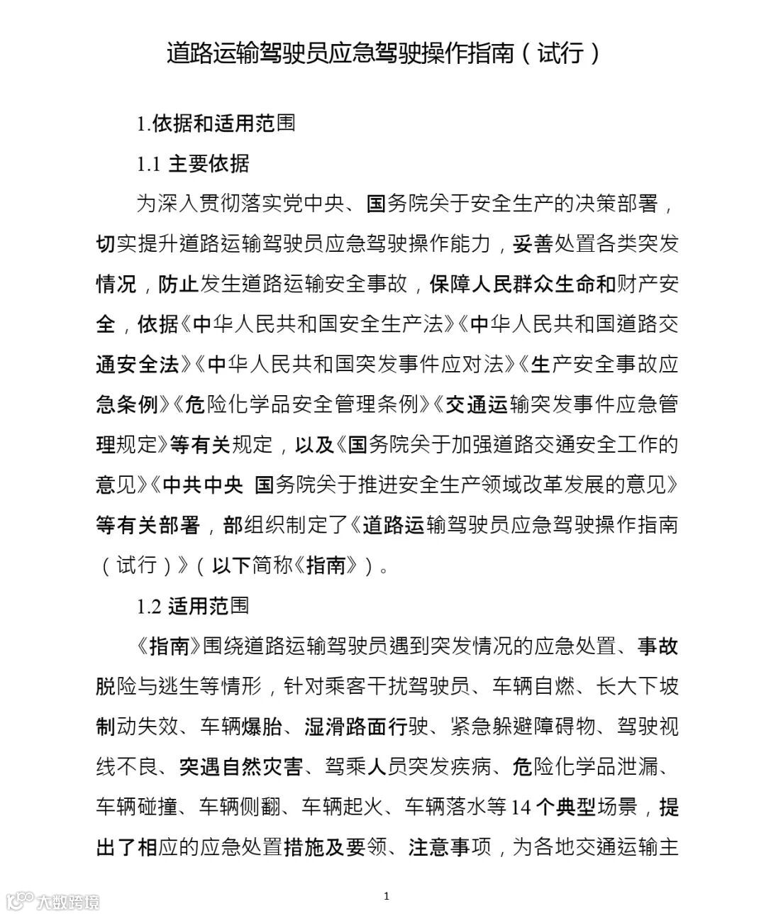 为深入贯彻落实党中央、国务院关于安全生产的决策部署,深刻汲取事故教训,提升道路运输驾驶员应急驾驶操作能力,部组织编写了《道路运输驾驶员应急驾驶操作指南(试行)》。现印发给你们,请积极宣贯推广,督促指导辖区内道路运输经营者学习借鉴,加强道路运输驾驶员应急驾驶技能教育培训,不断提升驾驶员应急处置能力。