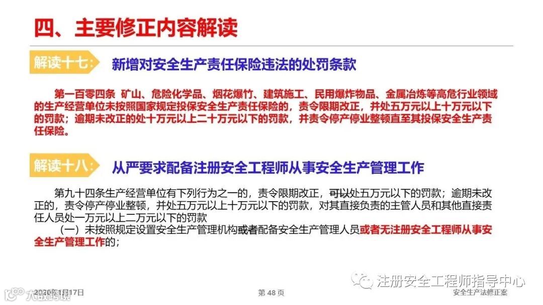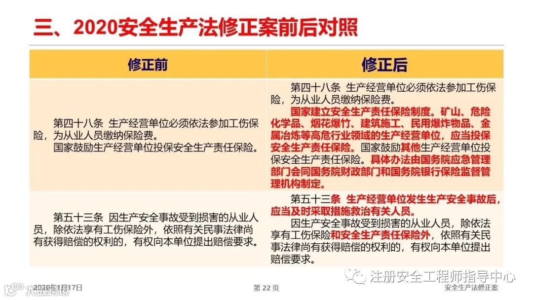 第四十八条修订,安全责任险。这是国外企业成熟的习惯做法,保险公司会对企业进行风险评估,并根据评估结果确定收费标准,这会一定程度上提高企业的自我管理,有利于实现企业主体责任的落实。这里需要强调一点,需要摸索出一个有效的模式,让保险公司和企业实现双赢,这样才有可持续性。