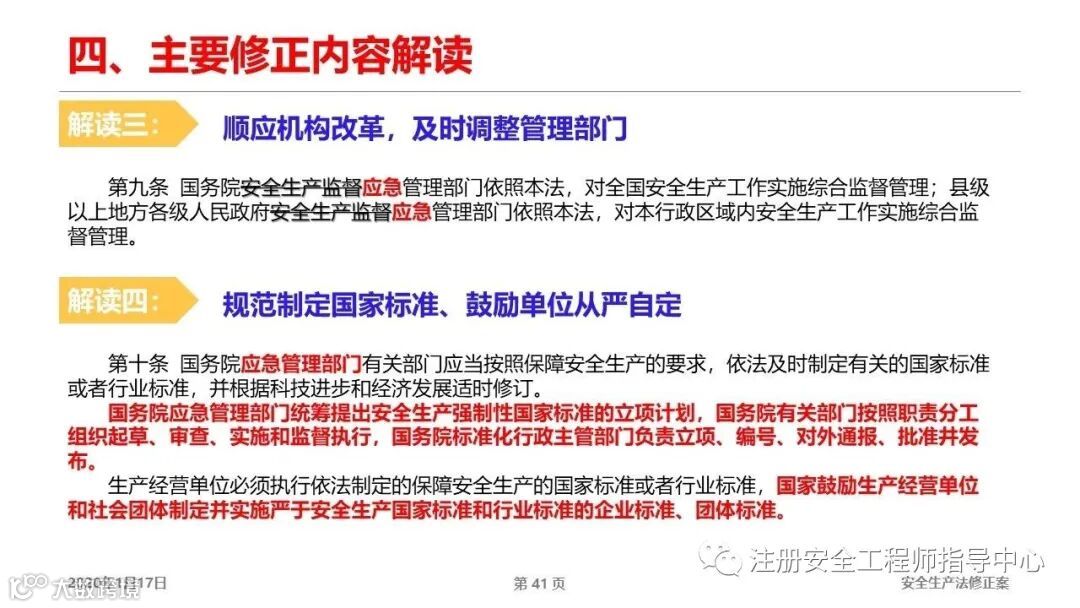 第9条修订是关于安全生产标准的,这是我们目前缺乏的。安全生产标准是法律法规体系重要内容,是指导企业如何管理安全的重要依据。举一个例子:当我们评估出一项机械风险,如何实施改进,如果没有标准指导,企业不清楚如何整改。再比如,机械安全认证,从本质安全角度,如何确保使用者的安全?就需要制定和实施机械设备的安全认证。国际上相关标准有CE认证,我们国家还没有。所有我们需要花大力气,把安全标准体系建立和完善起来。法律法规告诉我们应该干什么,不干的话会处罚。具体怎么干,就需要标准的指导。