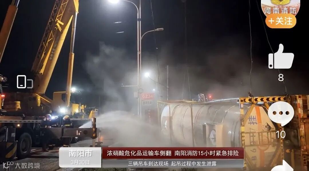 事件:3月30日20时,河南南阳市社旗县一辆载有31吨浓硝酸危化品运输车,在通过十字路口时为躲避突然窜出的农用车,急打方向后撞向路边发生侧翻。
