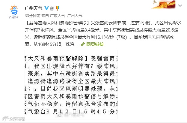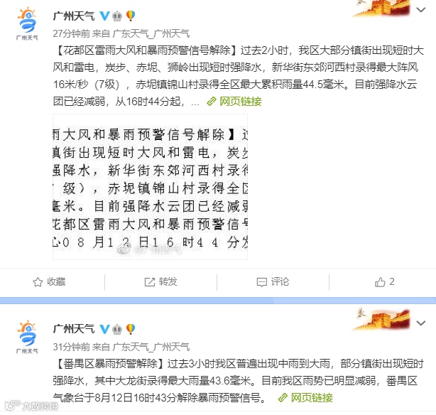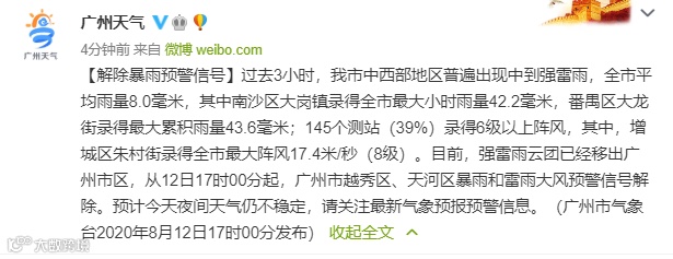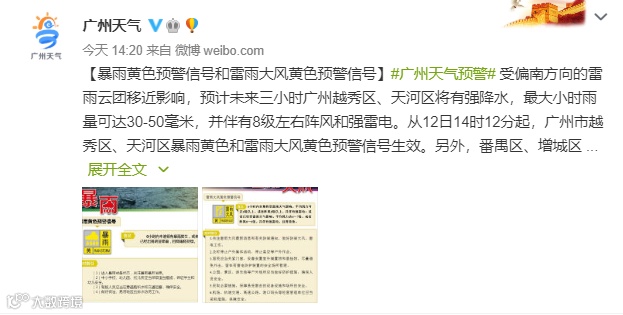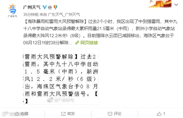 目前,强雷雨云团已经移出广州市区,从12日17时00分起,广州市越秀区、天河区、荔湾区、海珠区、番禺区、花都区等暴雨和雷雨大风预警信号解除。但预计今天夜间天气仍不稳定,请关注最新气象预报预警信息。