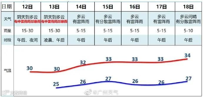 未来10天的天气,预计12-14日广州降水趋频密,有一次中雷雨局部暴雨天气过程,雷雨主要出现在午后,雷雨时局地伴有10-20毫米/小时的短时强降水及6—7级雷雨大风,高温缓解,最高气温32℃左右;15日起降水减弱,高温又将出现。